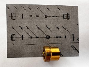 Housing of the bail-out non-return valve cone, used from circa 1963. Part number T2685.5318 in the Drager parts list. Between 1960 and 1963, a temporary part was used with an almost identical part number (T2685); this one has a thinner shaft for the cone, do not confuse this one.