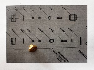 Hexagonal nut for attaching the spring to the bail-out non-return valve cone, used from approximately 1960. Part number U623.5318 in the Dreager parts list.